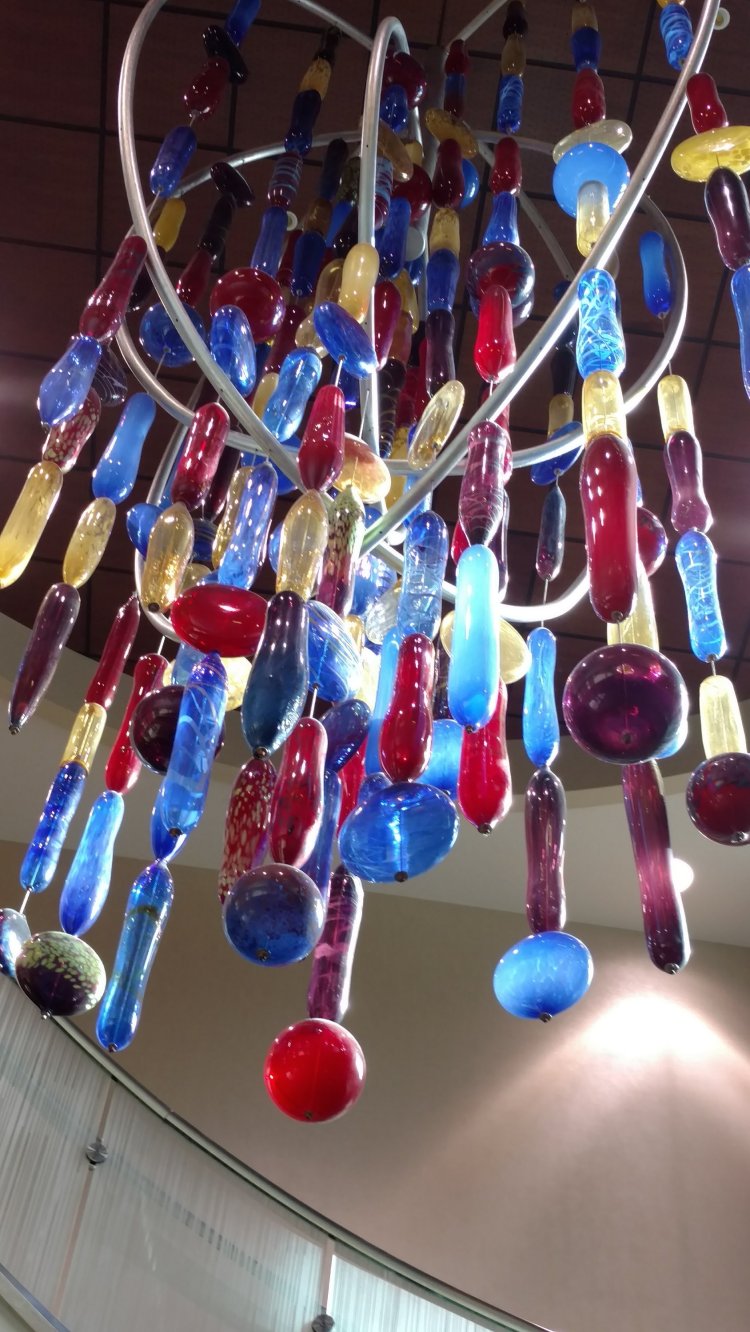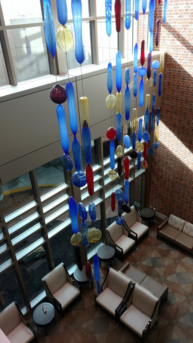 I have been spending quite a bit of time at the hospital with hubby. As we have spent many hours in waiting rooms and now hospital rooms it has given me time to appreciate the beautiful artwork surrounding me. This starts the minute you walk into the hospital. This beautiful glass artwork hangs from the ceiling of the 3rd floor and is observerd from the 3rd floor and the 1st floor looking up. So beautiful. This includes the staircase.