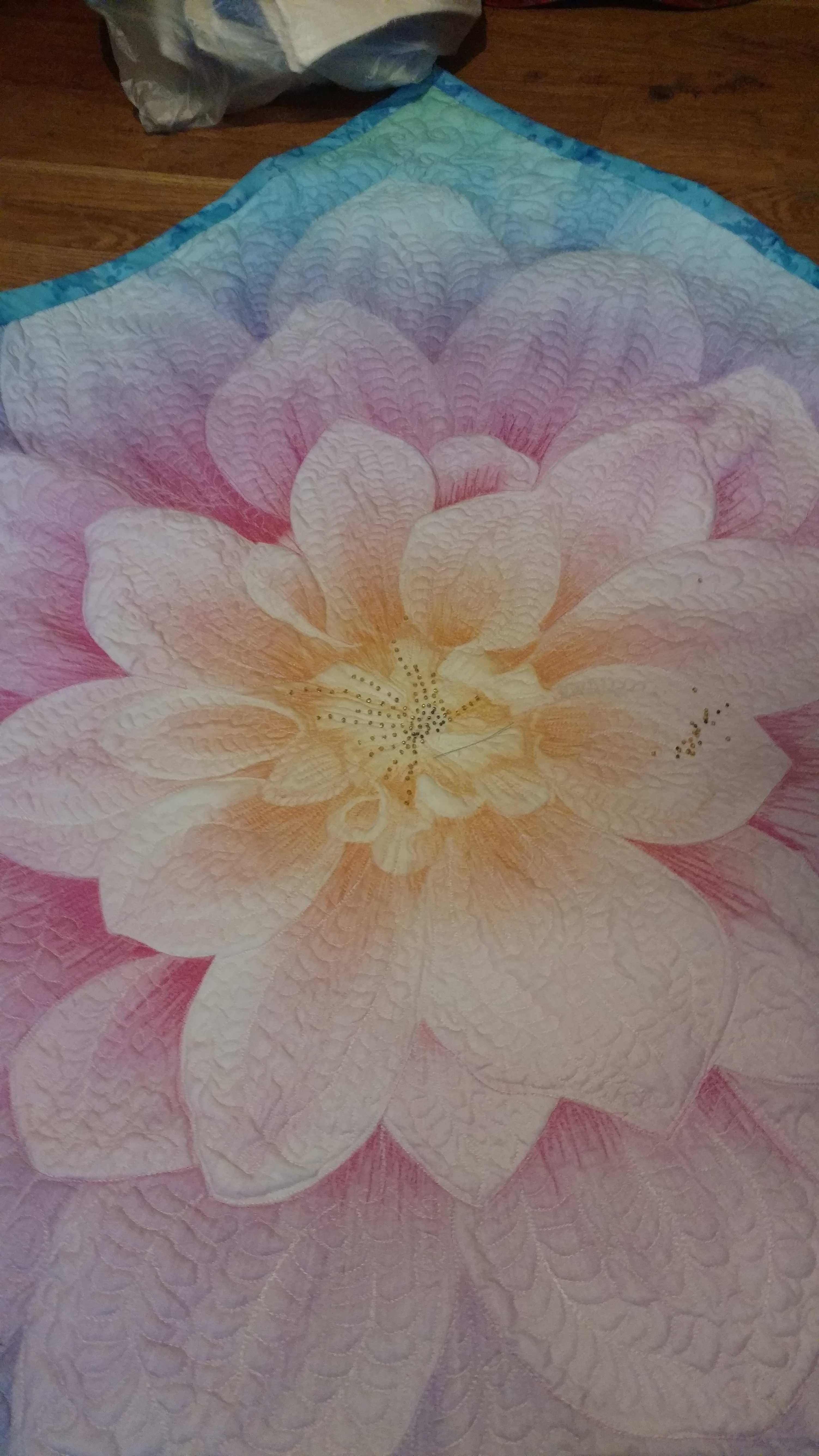 With New Years just around the corner, I have been thinking of “New Year’s Resolutions”. My resolution is to make weekly lists and journal more. I also joined in on a Quilting UFO Challenge with APQS and Farmhouse Quilts. The first thing I needed to work on was the Flower Wallhanging. I decided to add beads to it. I think this is looking better with the beads. I am asking for your thoughts on this.