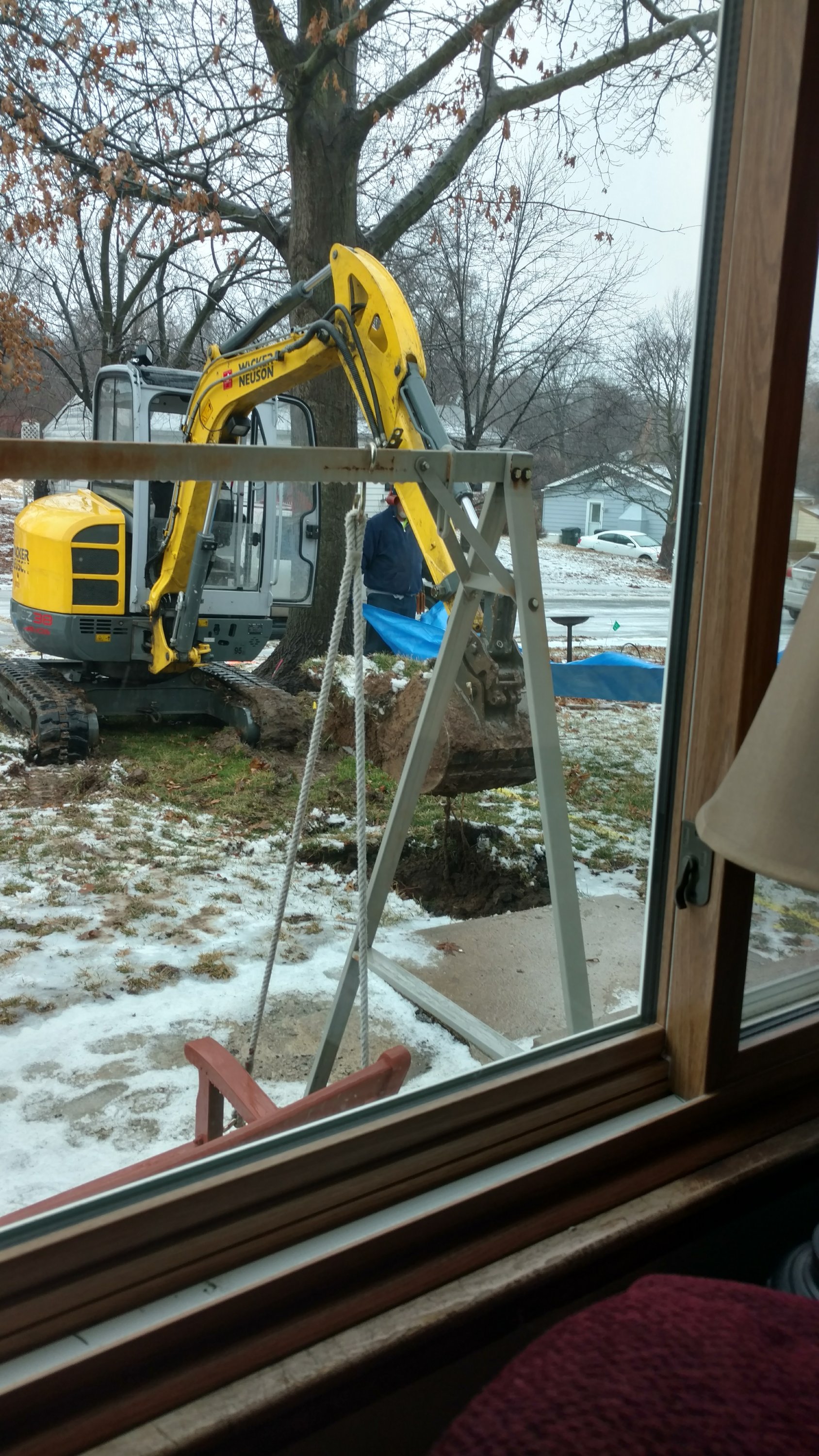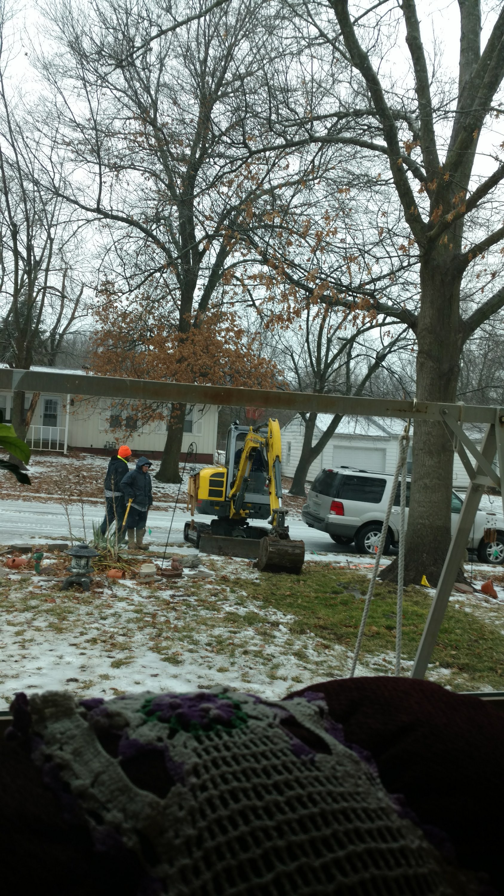 Last I posted we had a broke water main. Well the plumbers were out in the freezing rain slipping and sliding around the yard fixing the main. Here are a few photos of what the process looked like. Hubby had been babying the yard all summer when it was dry so it would look nice. Now this.