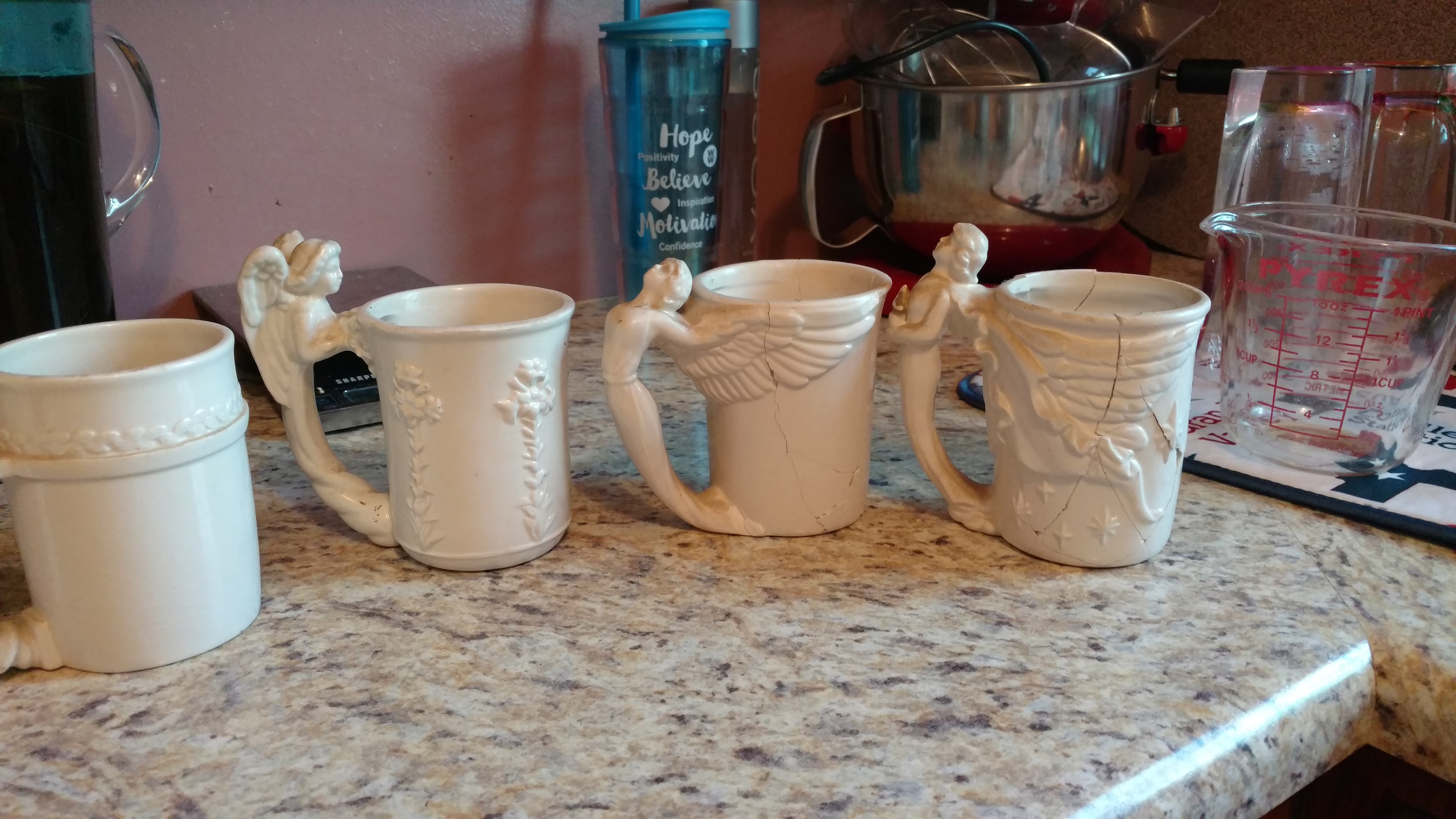 As I was cleaning the house today, dusting, hubby asked why I kept these 4 mugs. Yes they are cracked and not any use, BUT, those were my mother’s and she isn’t with us anymore. They were damaged in the mail . I sat gluing them together crying like a child who was told no. I showed him the 1st mug, it was all in one piece, I told him this represents us as newly weds, the next was cracked. Little life struggles, the third in many pieces . I said this represents the worst struggles of our life together, and the 4th not broken but cracked and chipped. Us 47 years later very happy. He thought for a few minutes and said “Good one, Jack” and walked off. I didn’t know if I should laugh or go after him and kick him in the back end. Good one, Gary.
