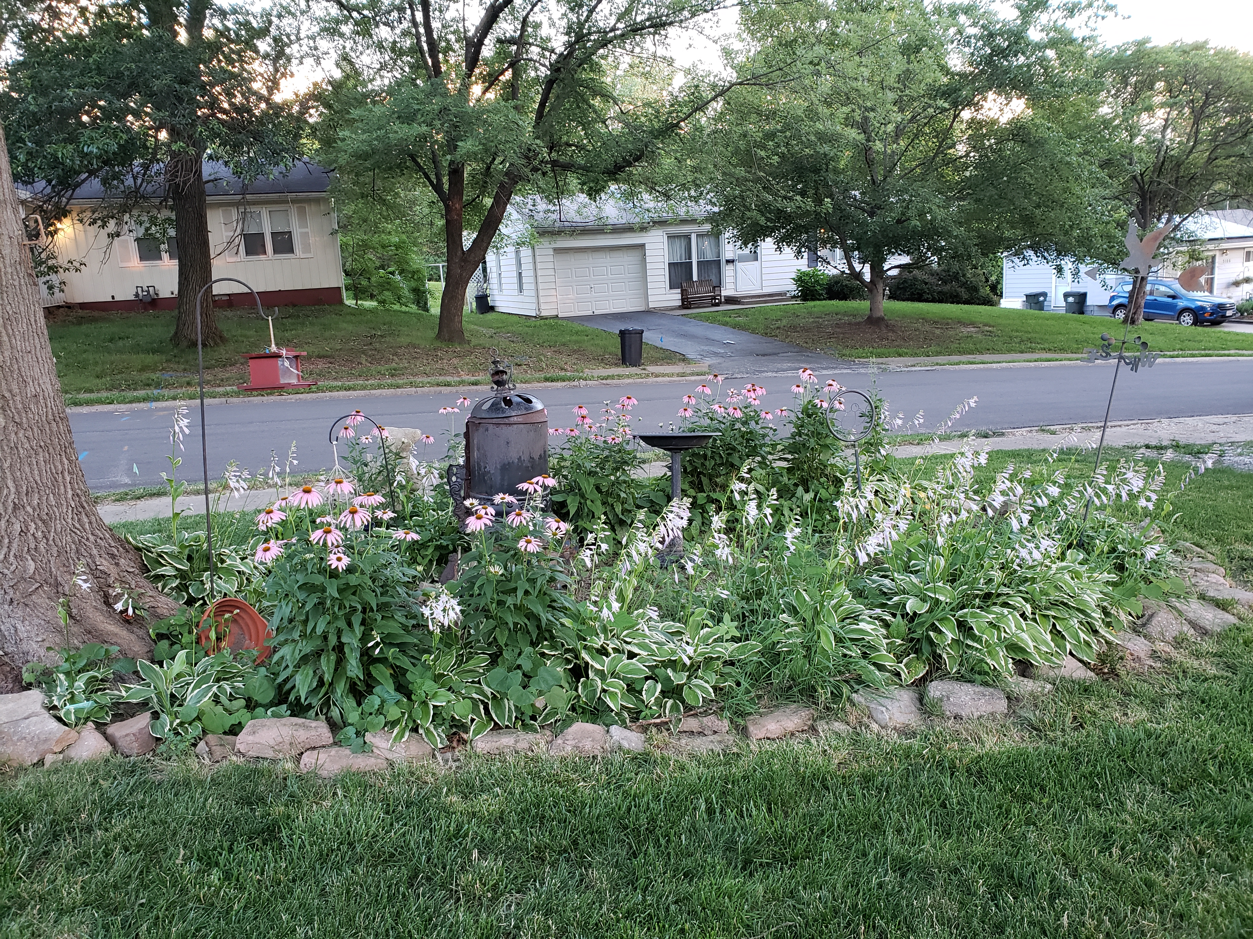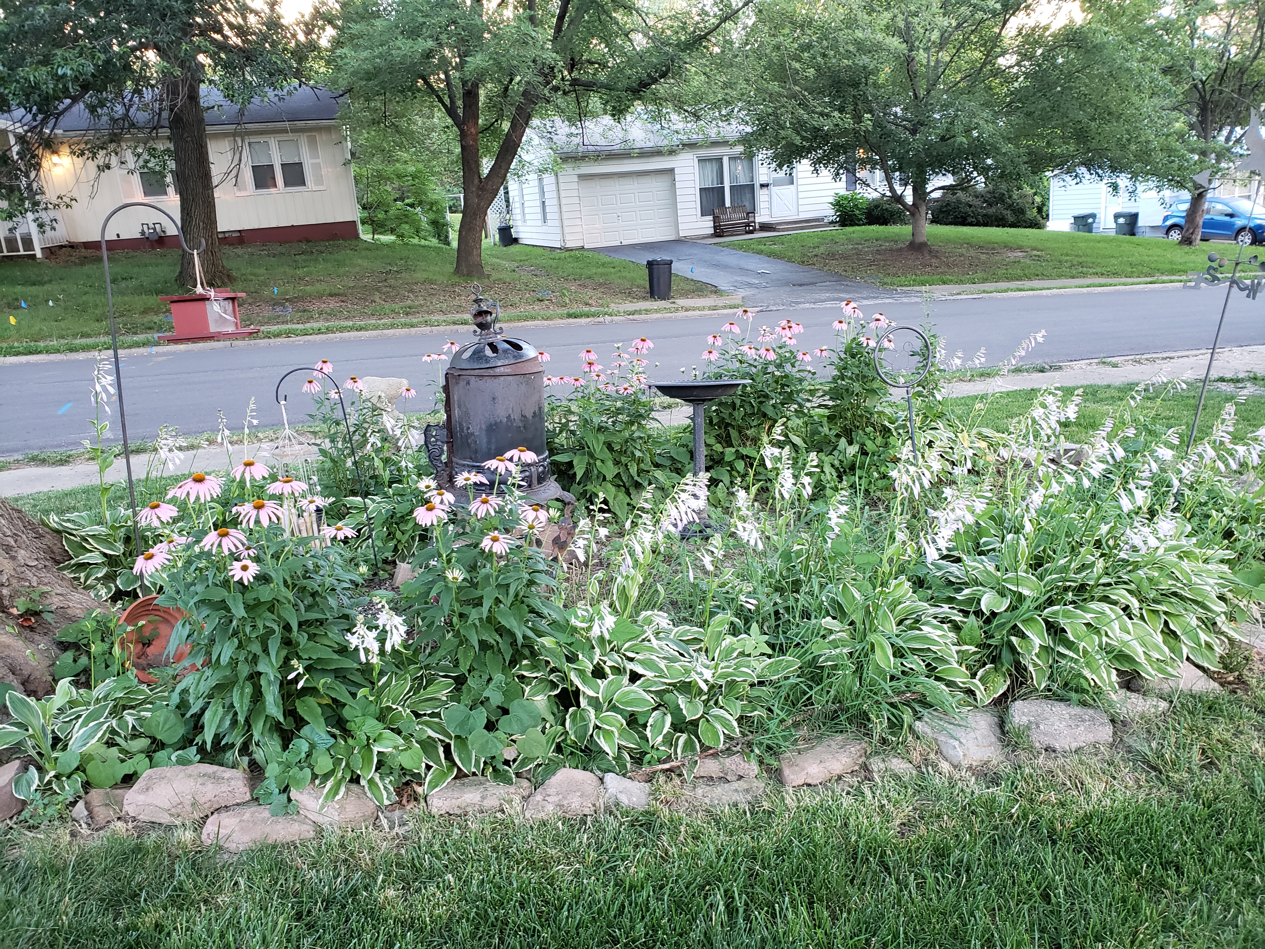 Wednesday morning as I was leaving the house I noticed my garden in the front yard. It is badly in need of some TLC. I had foot surgery and had to stay off it for a little over a month and 1/2, then Hubby has been in the Hospital. It still looks beautiful and today Destiny will be working in the front and in the back yard weeding. I want to get a few flowers to plant, but have lots of work ahead of me before doing that.