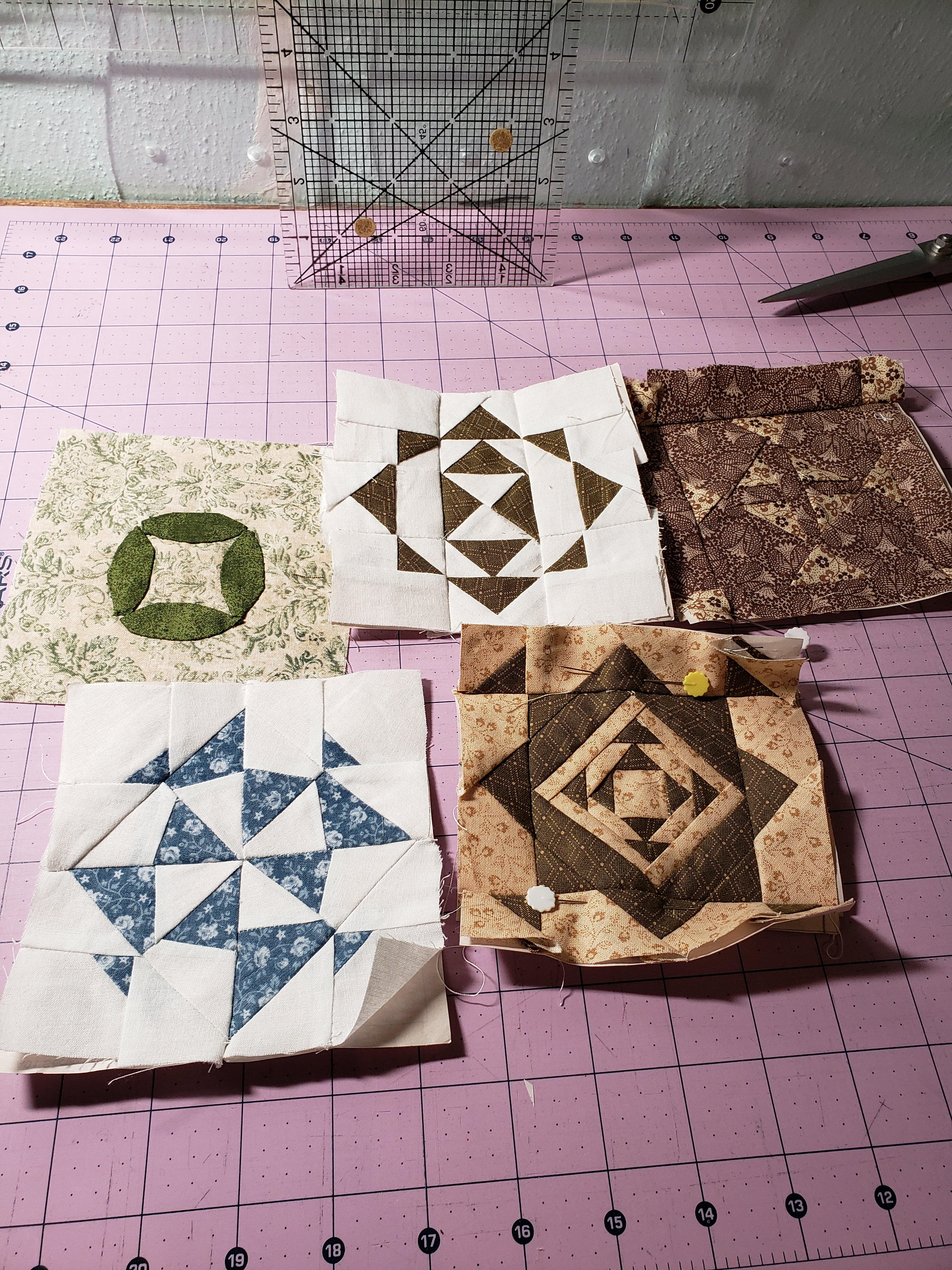 After a few days of not knowing what to start working on I now have 4 projects in the works. I now have 5 blocks of a Dear Jane quilt made and only 105 more to do. Not bad right?