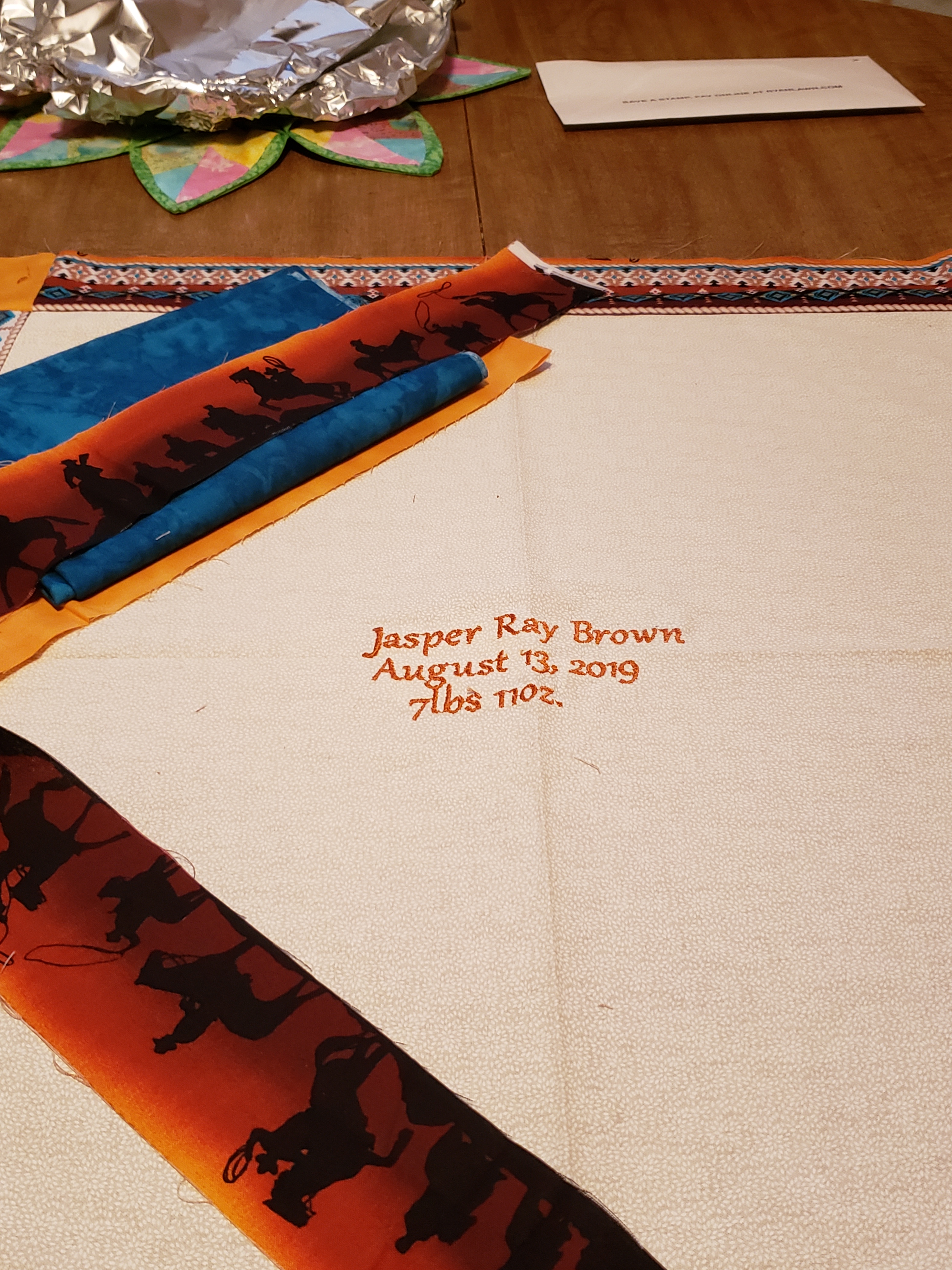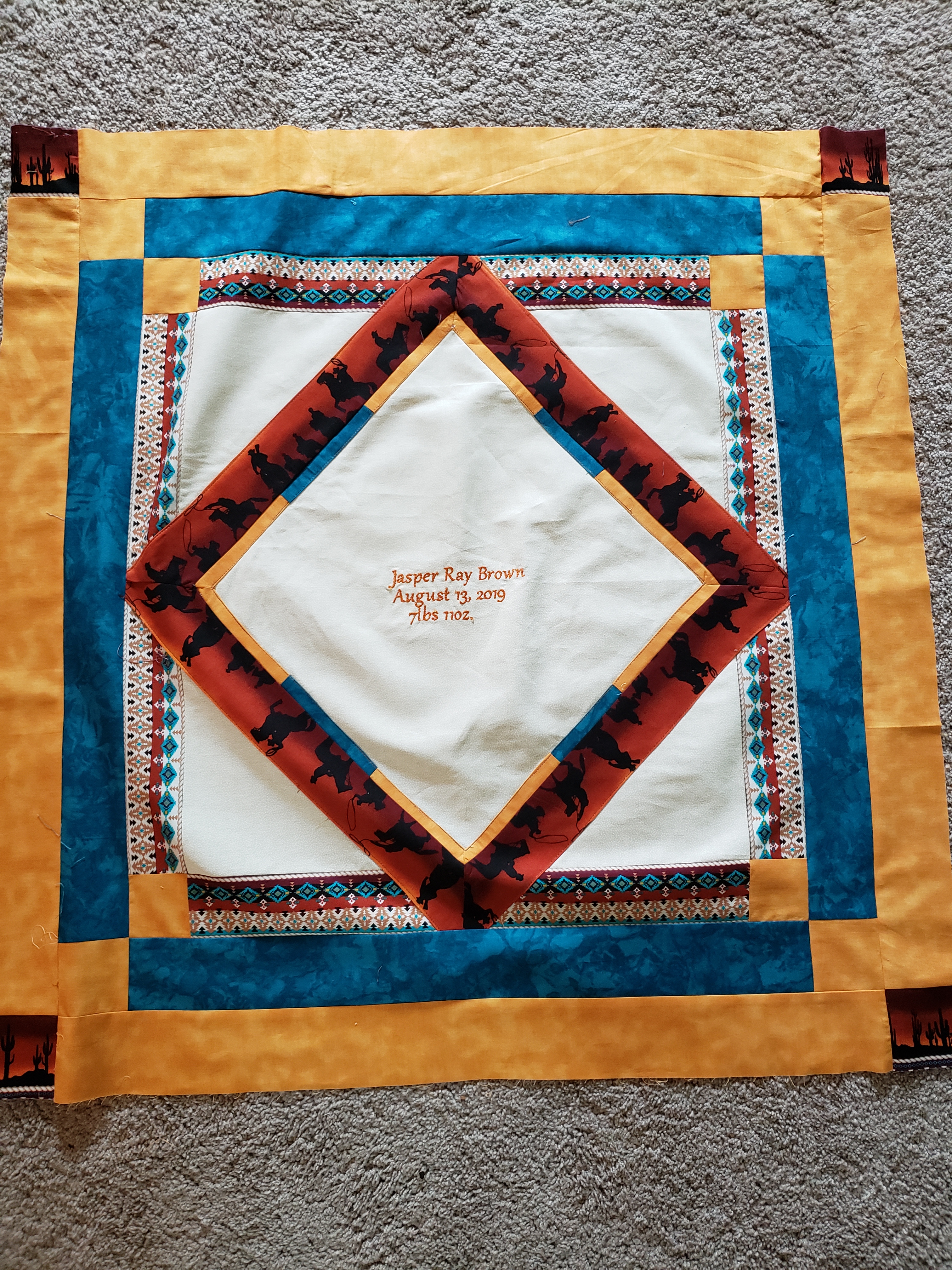 This week I have started a baby quilt for my Nephew and Niece’s new baby. He arrived on the 13th. All I knew is their theme for the nursery was “wild and free” . They live in Texas and both are outdoors people, who live and work a ranch. Michael(nephew) is a true cowboy and loves the work. Sarah(his wife) is right there with him sooooooooooooooo as I was looking thru the fabric stash this is what I came up with.
