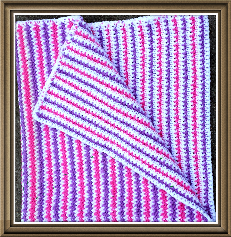 I used 2 skiens of each pink, purple and white Red Hart WW yarn and an “I” hook, but one color at a time.