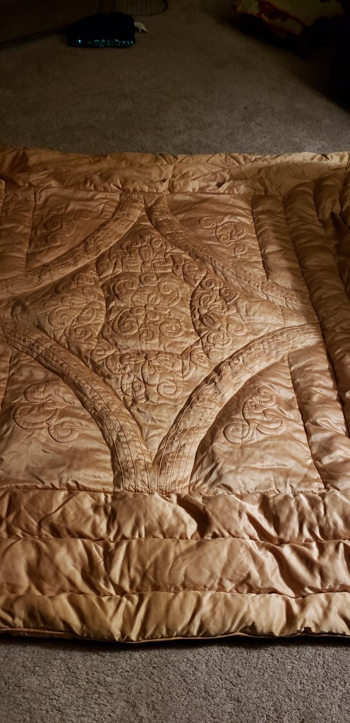 I have an old comforter that was given to me by my Great Aunt. Her mother made it for her when she was in her early 20’s as a wedding gift. Going back into my genealogy this was about 1920’s. That era. She kept it on her bed until her husband died and then stored it in a closet. It had some holes worn into it when I got it, but I didn’t care. To hold something in my hands that had been made by my Great Grandmother was wonderful. I have kept it unused wrapped in an old sheet(the way I brought it home) for 47 years. It is filled with down feathers and is satin. There are places on the comforter that the fabric has worn from years of use, but I don’t want to “USE” it but I do want to appreciate it. I want to be able to see all the detail. I am thinking that the best way for me to do this is to make a case for it out of an organza as close to the color as I can match to the original. Insert the old one into the case stitch it closed and then hand stitch the design thru all the layers and use it as a wall hanging.