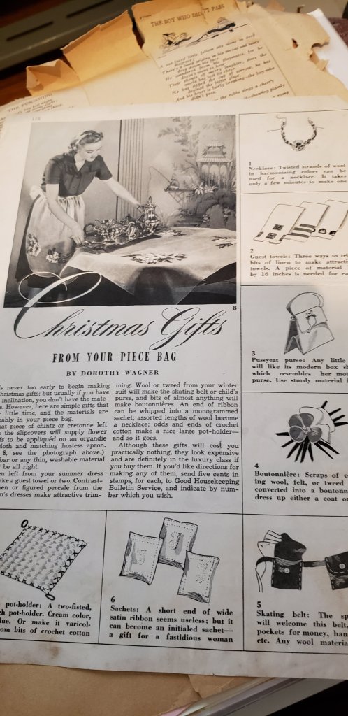 I was looking thru a scrap book my Mother In Law had kept and found a magazine article about Christmas Gifts to make and give. This was from the 1945ish era. What a fun find.