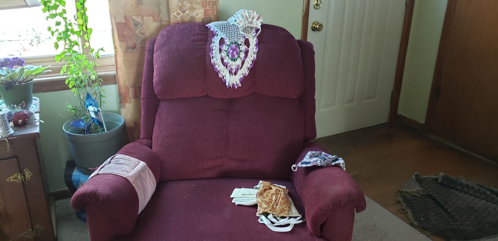 As I started on the journey of making masks, I was reading how some people were looking for masks and couldn’t afford to pay $20-30 for them. My dad would raise from his grave and kick me square in the butt if I were to sell any. So I started giving them to people in my neighborhood. This EXPLODED…. One lady came by 3 times bringing fabric, others elastic, or took to people who couldn’t get out. This neighborhood and outside it started working together. I was so inspired by these lovely people that with the help of Hubby supervising, my son cutting wire for nose pieces, 2 Granddaughters and daughter in law cutting fabric, 1 daughter sewing, and another taking to mail. Oh and can’t forget, each set of masks leaving the house get 1 “Destiny Original” drawing by a 5 yr old, we have as of today made 650 + masks. With the exclusion of all else we’ve been consumed with mask making. These are what is left to be picked up.