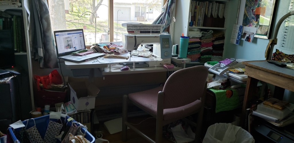 The ones in bags are groups of 6 or more, on the sofa are groups of 1-5 and in the chair are for people on the way. Now the next few photos are of my sewing room right now. Tomorrow I am taking a day of cleaning then sewing.