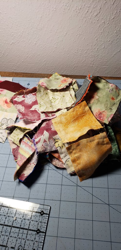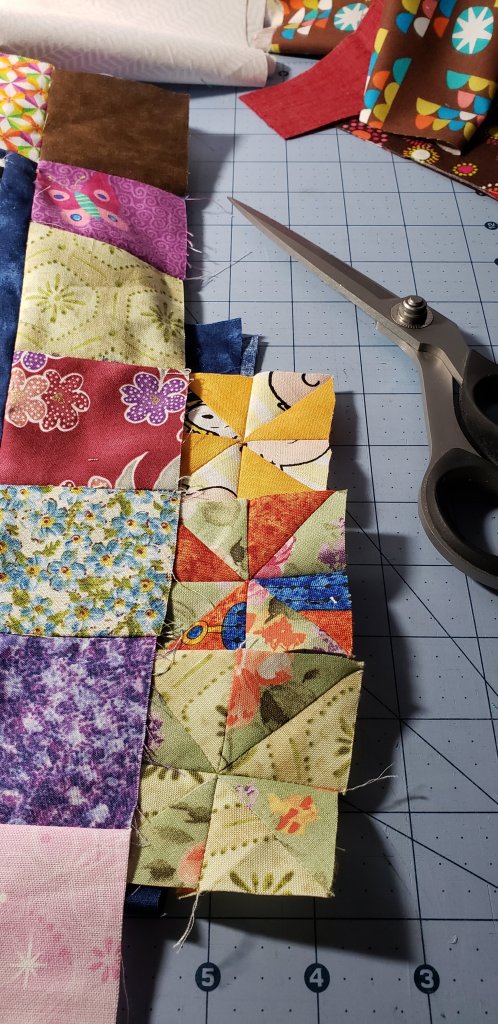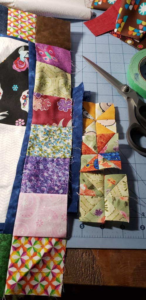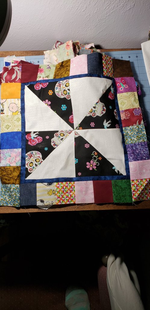 Decided it needed a little dark border then the squares. I have been making smaller pinwheel blocks to add to this. The finished size will be a lap quilt size.
