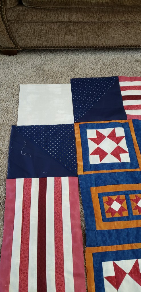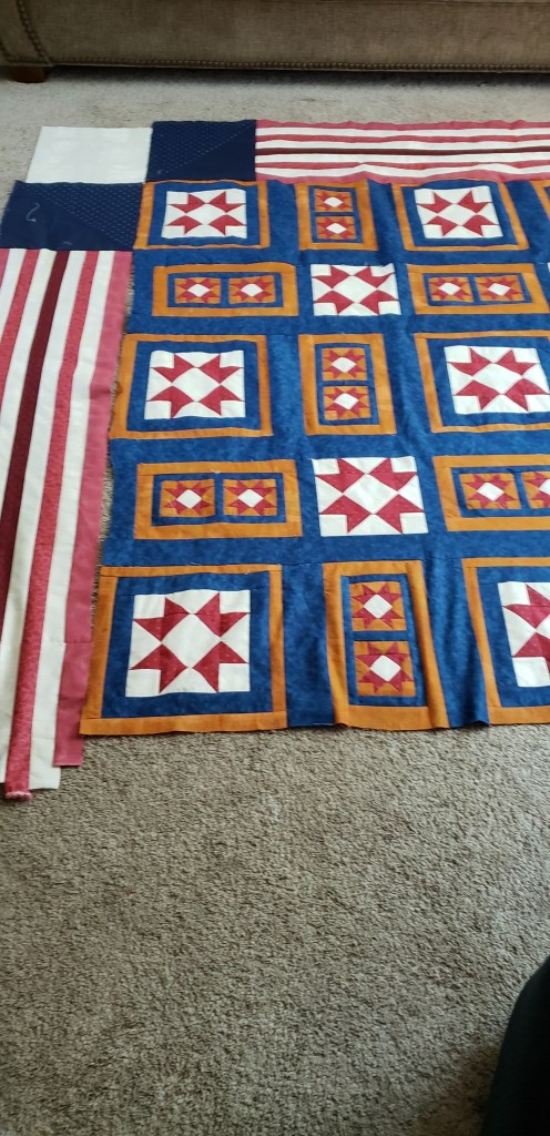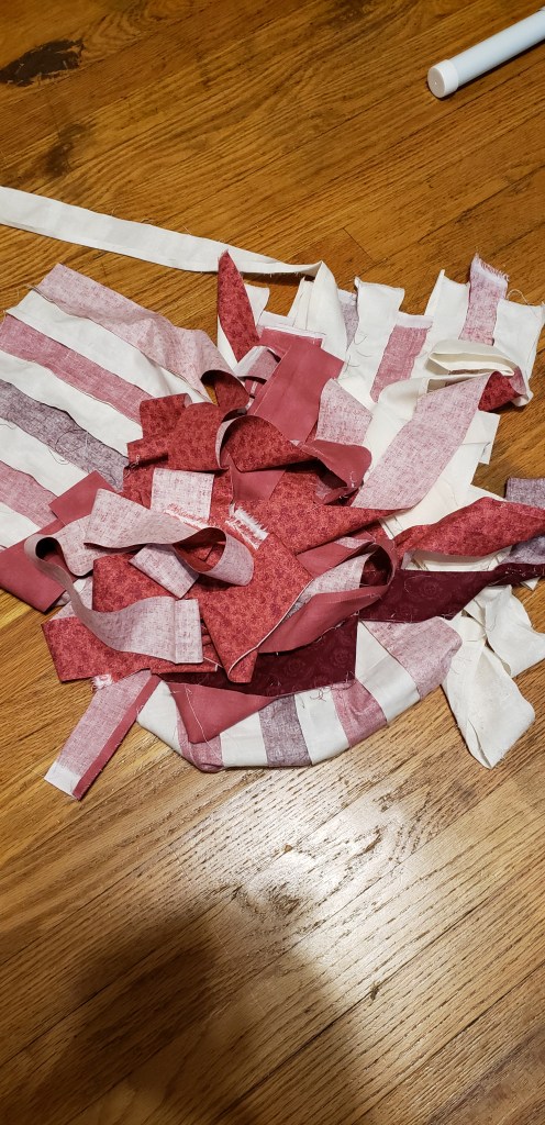You make a big and I do mean BIG goof. I was cutting 2 inch strips, got them done and sewed them together. 2 inches by WTF, 5 reds and 4 off white. I was doing fine and got too over confident with my measuring and cutting. The off white when opened out looked like a drunken line. I had 1 uneven fold and had to refold it and recut it. I had one piece 11×44 inches left over. Not bad. I had bought a little extra just in case and so all is good. NOT. The pattern says to cut an 11 inch square for the final block. I had cut that and something is off. All measures are as written, this time I have remeasured twice and all is good, except the 11 inch square. It is 1 inche off on top and bottom. So tomorrow I go back to the quilt shop and get some more of this fabric. It is Moda fabric ( I love Moda), but hope they have what I need. If not the hunt is on.
