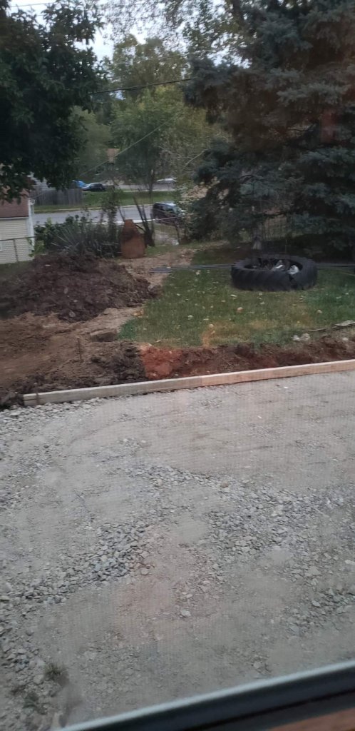 The patio waiting. The light brown is where the city dug to bury the line. The dark is fresh dirt from the patio and will be spread thru out the yard where there is still a trench from the city.