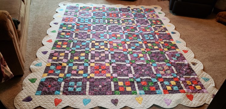 The same quilt only different colors and the scallops. The last 2 were made for a friend and her sister made from their mom’s clothes. The 2nd one had several different fabric types in it and took longer ue to the different fabrics some cut on bias and some knits. They were stretchy. But they were fun.