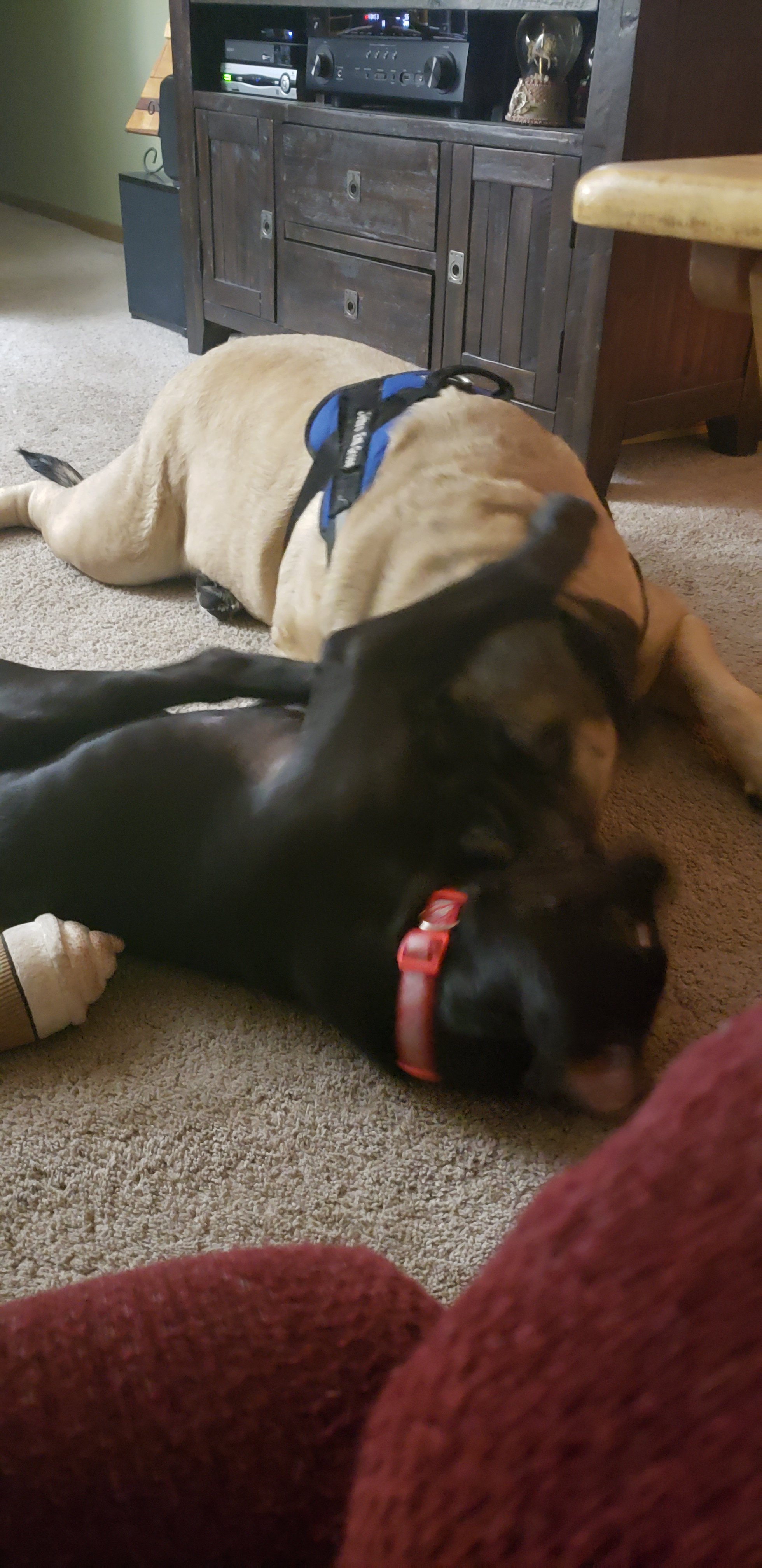 I know I have written about Jethro, our Granddog. Well last month he got a little brother. His brother is 1/2 Great Dane, and 1/2 English Mastiff. His name is Maverick. Maverick is about 4 months old and already is 30ish pounds. I will leave you with a picture of the two dogs playing in my living room. I hope everyone has a great day.