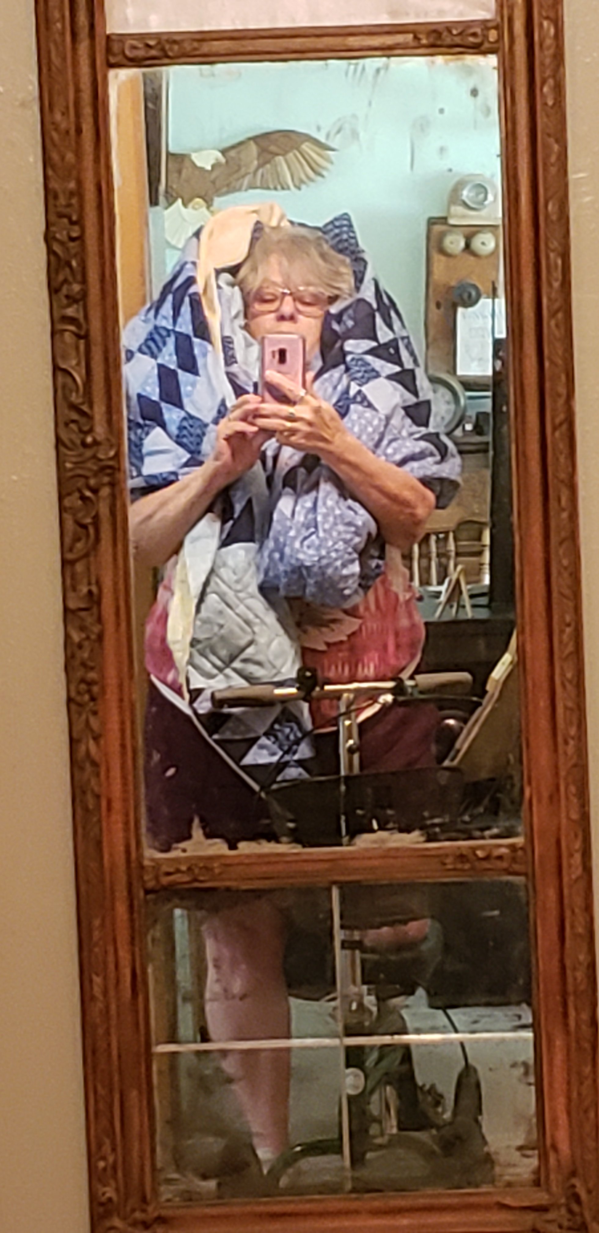 I was going to post a photo of my foot, but my hubby said it was too “gross” to post. So I will post a funny photo instead. I was trying to get my quilt from the living room to the sewing room while hubby was napping, so “Necessity is the Mother of Invention”