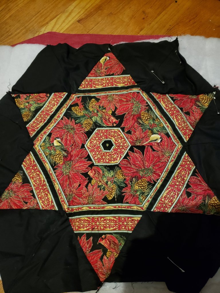 This started out to be a table runner, but as I was playing around this turned out to better than I wanted. All it is is 6.5 inch strips cut into 60 degree triangles. Will fit on my table for Christmas until I put the leaves in the table.