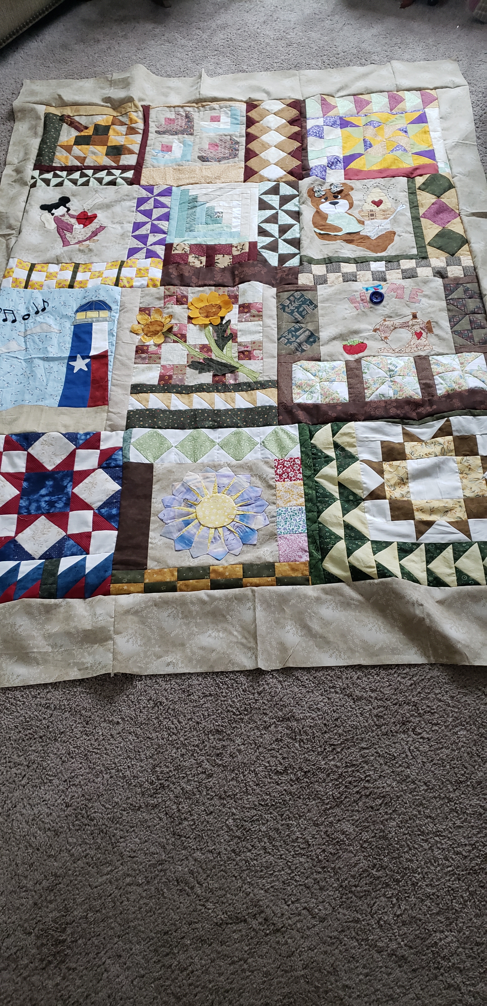 The funny part of this quilt is that I didn’t like the width of the quilt after getting borders on and had 10 extra blocks, but it took 7 blocks for each side. It was past midnight and I said what the heck and sewed blocks together, then cut them down the center and added 1/2 to each side. I kinda like the look of this and is a one of a kind. Sometimes you gotta do what you gotta do. I hope everyone has a wonderful evening and stay safe and well.
